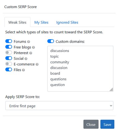 Chef counts the SERP scores by using a list of words like topics, threads, blogspot etc.. And they have done a good job, and it also allows us to add our own words and I usually have these: