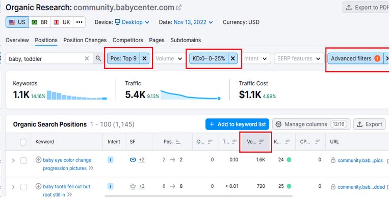 - You can also filter by specific words you want the keywords to have, or even filter out words (advanced tab) you don’t want the keywords to have. Remember Semrush looks for just letters and not words (you can set it that way too). For example if you want keywords related to gaming, typing “gam” will show both “games” & “gaming” or anything that has “gam” inside)