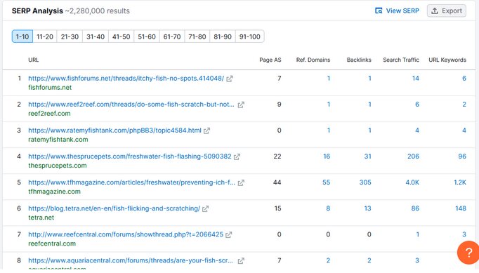 - Type of pages/sites ranking. Eg – forums, Q/A sites, blog posts, scraper sites..